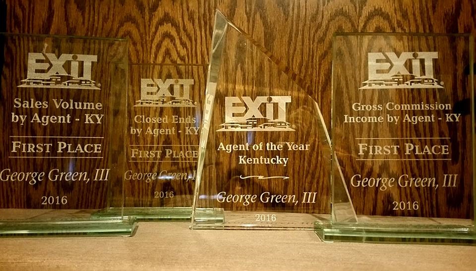 Congratulations to George Green and the Exit Realty Crutcher team for bringing home an unbelievable number of awards as a group. George brought home four 1st place awards, including 1st place in Kentucky by sales volume, gross commission, and closed ends. He also brought home the top award of AGENT OF THE YEAR for all Exit franchises in Kentucky!!!