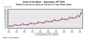 Recent data from the U.S. Census Bureau corroborates the e-commerce element of this story line. From the fourth quarter of 2011 to the fourth quarter of 2019, the share of retail sales taking place through e-commerce grew steadily from 5.1% to 11.3%, an average increase of 78 basis points per year. With the onset of the pandemic, the e-commerce share surged to 16.6% in this year’s second quarter – a year-over-year change of 530 basis points, or almost 7 years of change at the previous pace.